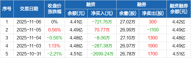 融资方面,当日融资买入2796.26万元,融资偿还3518.02万元,融资净偿还721.76万元。融券方面,融券卖出1200股,融券偿还900股,融券余量27.02万股,融券余额48.37万元。融资融券余额合计4.42亿元。
