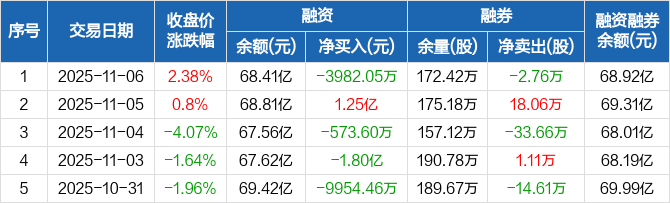 紫金矿业:融资净偿还3982.05万元,融资余额68.41亿元(11-06)