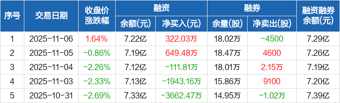 融资方面,当日融资买入4317.91万元,融资偿还3995.88万元,融资净买入322.03万元。融券方面,融券卖出0股,融券偿还4500股,融券余量18.02万股,融券余额714.65万元。融资融券余额合计7.29亿元。