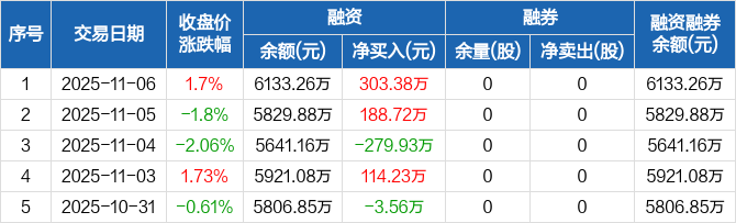 罗普特:融资净买入303.38万元,融资余额6133.26万元(11-06)