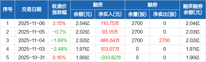 融资方面,当日融资买入954.64万元,融资偿还843.89万元,融资净买入110.75万元,连续4日净买入累计793.61万元。融券方面,融券卖出0股,融券偿还0股,融券余量2700股,融券余额6.68万元。融资融券余额合计2.04亿元。