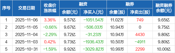 融资方面,当日融资买入4793.6万元,融资偿还5845.14万元,融资净偿还1051.54万元,连续5日净偿还累计6555.05万元。融券方面,融券卖出3899股,融券偿还3150股,融券余量11.02万股,融券余额775.51万元。融资融券余额合计9.65亿元。