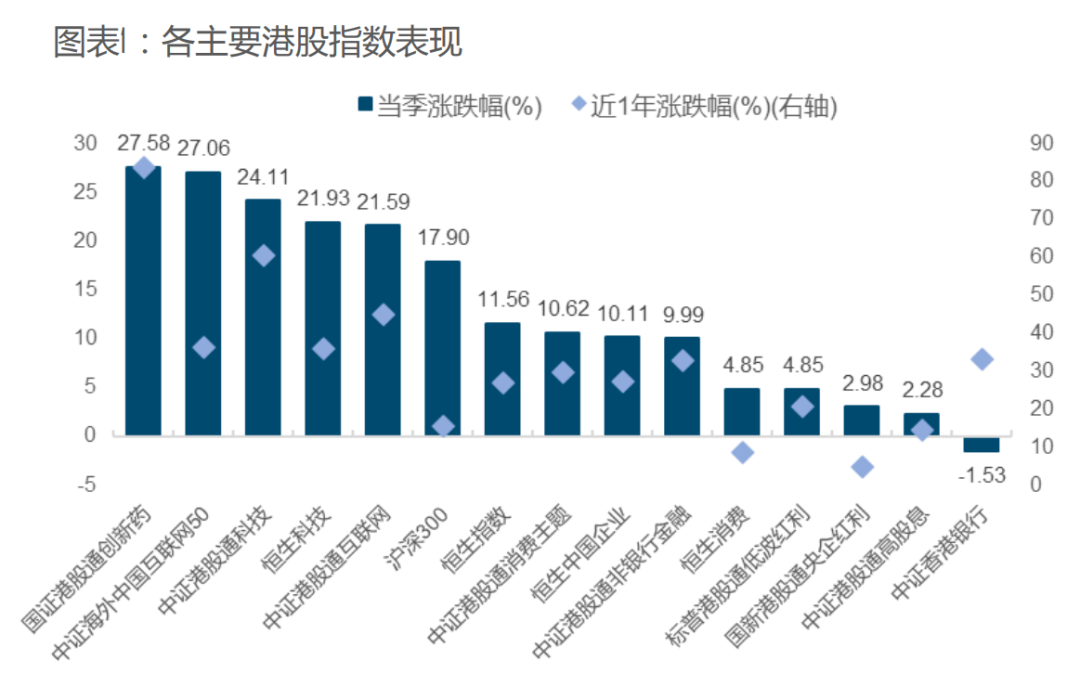 行业方面,当季12个恒生行业指数有11个收涨,其中恒生原材料业(58.79%)在黄金等有色金属大涨背景下大幅领先,医疗保健(32.11%)非必需性消费(25.04%)、资讯科技(22.67%)季度涨幅超过20%;仅电讯业(-2.49%)小幅下跌。