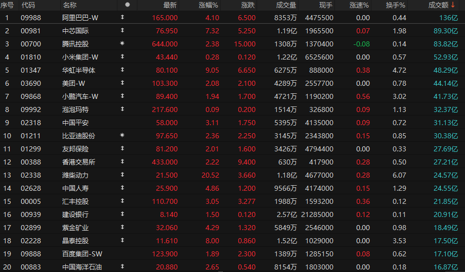 盘面上,作为市场风向标的权重科技股集体上涨助力大市向好。半导体板块、有色金属板块强势走高,中国铝业大涨超11%,中国宏桥创历史新高!氢能源概念股、保险股上涨;出版概念股持续走低,华泰瑞银跌超17%,医疗及医学美容服务板块下跌,德斯控股暴跌17%。