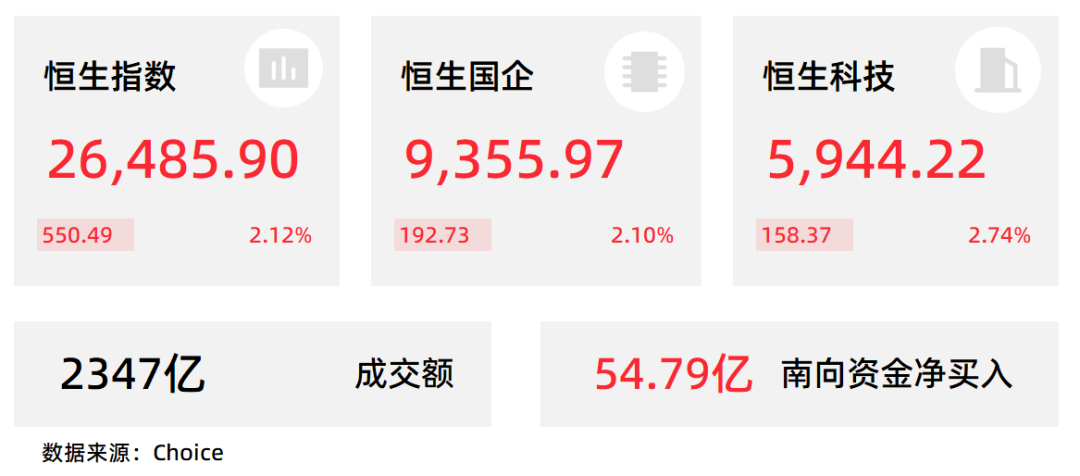 11月6日,港股三大指数呈现高开高走行情,市场做多情绪回稳,一举收复月内全部跌幅。截止收盘,恒生科技指数尾盘一度涨至3%,最终收涨2.74%,恒生指数、国企指数分别上涨2.12%及2.1%,恒指上扬达550点报26485点。