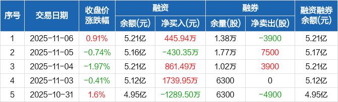 融资方面,当日融资买入2095.55万元,融资偿还1649.6万元,融资净买入445.94万元。融券方面,融券卖出0股,融券偿还3900股,融券余量1.38万股,融券余额42.72万元。融资融券余额合计5.21亿元。