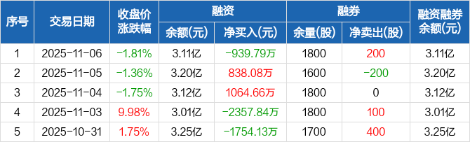 融资方面,当日融资买入3682.21万元,融资偿还4622万元,融资净偿还939.79万元。融券方面,融券卖出200股,融券偿还0股,融券余量1800股,融券余额3.72万元。融资融券余额合计3.11亿元。