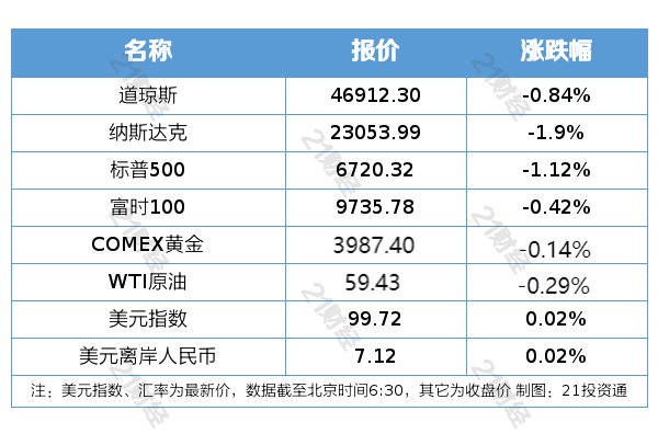纽约股市三大股指11月6日下跌。截至当天收盘,道琼斯工业平均指数比前一交易日下跌398.70点,收于46912.30点,跌幅为0.84%;标准普尔500种股票指数下跌75.97点,收于6720.32点,跌幅为1.12%;纳斯达克综合指数下跌445.805点,收于23053.99点,跌幅为1.90%。