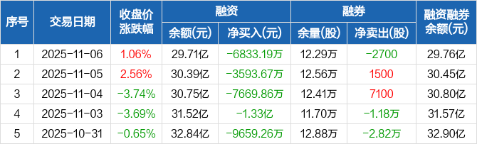 融资方面,当日融资买入2.58亿元,融资偿还3.27亿元,融资净偿还6833.19万元,连续5日净偿还累计4.1亿元。融券方面,融券卖出4100股,融券偿还6800股,融券余量12.29万股,融券余额537.44万元。融资融券余额合计29.76亿元。