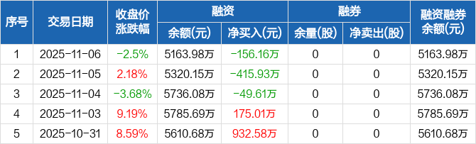 融资方面,当日融资买入464.82万元,融资偿还620.99万元,融资净偿还156.16万元,连续3日净偿还累计621.7万元。融券方面,融券卖出0股,融券偿还0股,融券余量0股,融券余额0元。融资融券余额合计5163.98万元。