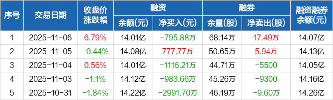 东北证券:融资净偿还795.88万元,融资余额14.01亿元(11-06)