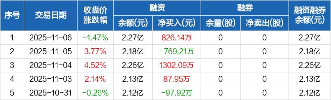 三友联众融资融券信息显示,2025年11月6日融资净买入826.14万元;融资余额2.27亿元,较前一日增加3.78%。