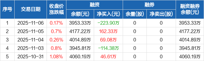 仁信新材融资融券信息显示,2025年11月6日融资净偿还223.9万元;融资余额3953.33万元,较前一日下降5.36%。