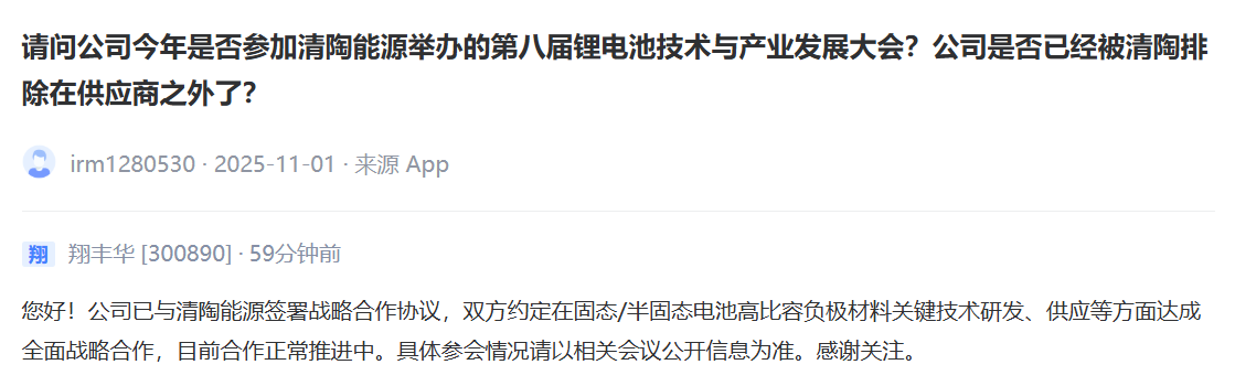 翔丰华:已与清陶能源签署战略合作协议 合作正常推进中