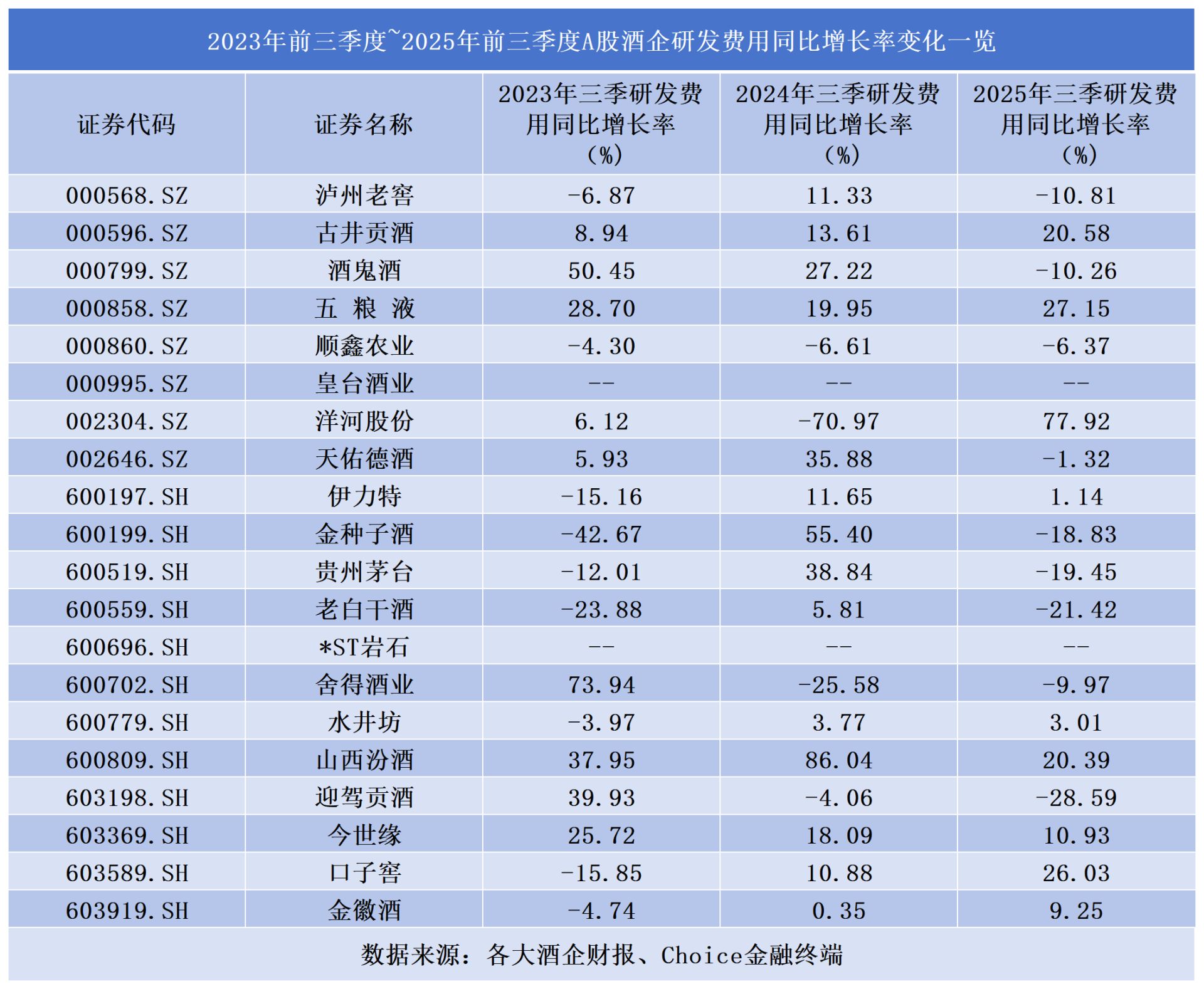 此外,2023年前三季度~2025年前三季度,18家A股酒企中,研发费用同比正增长的企业分别为9家、14家、9家。而今年前三季度,洋河股份、五粮液、古井贡酒、山西汾酒等均实现超20%的同比增长。