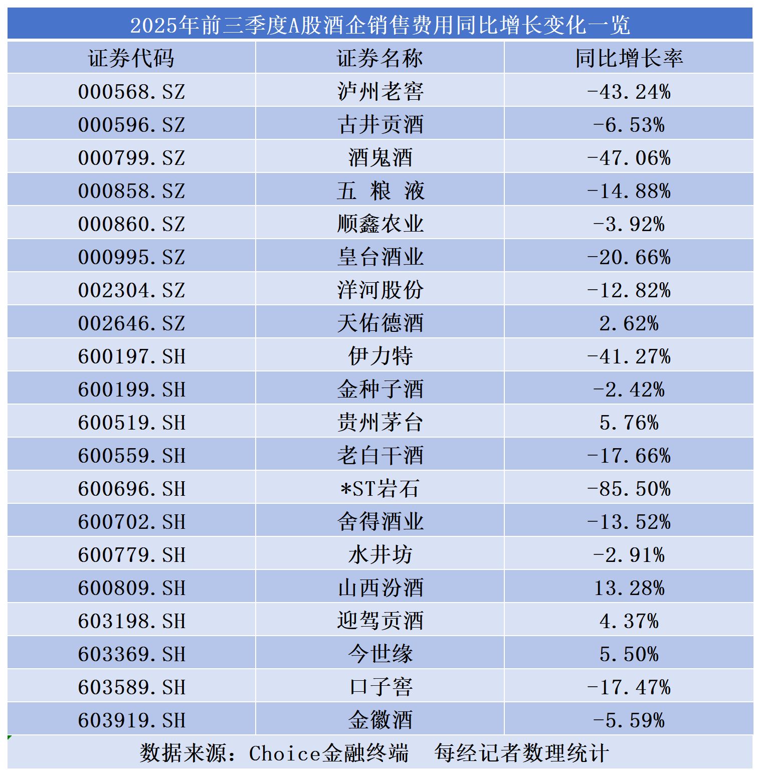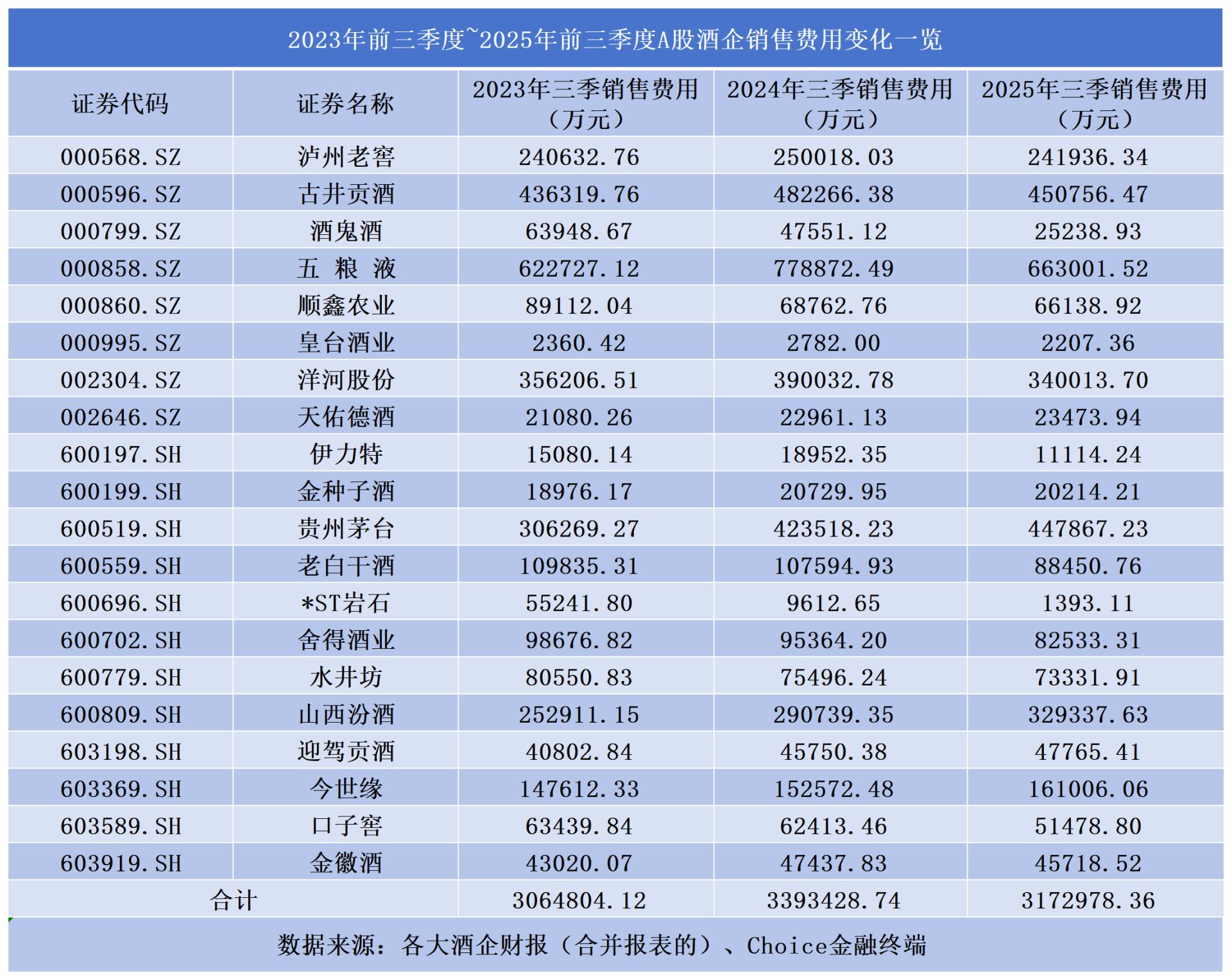 数据显示,2025年前三季度,20家A股酒企销售费用合计约317.29亿元,同比下滑6.5%;其中15家酒企销售费用同比下降,占比达75%,较2024年前三季度进一步扩大,酒企“降本潮”持续升温。