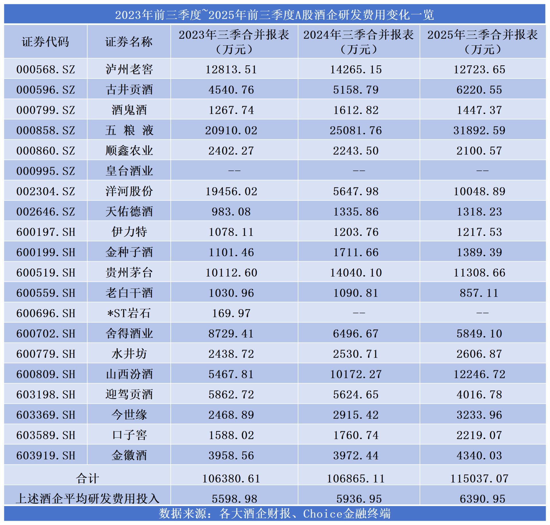《每日经济新闻·将进酒》记者梳理发现,2023年前三季度~2025年前三季度,20家A股酒企累计研发费用呈不断增长趋势。其中,2025年前三季度,18家A股酒企累计研发投入达11.5亿元,同比增长7.65%;每家企业平均研发费用投入达6390.95万元。