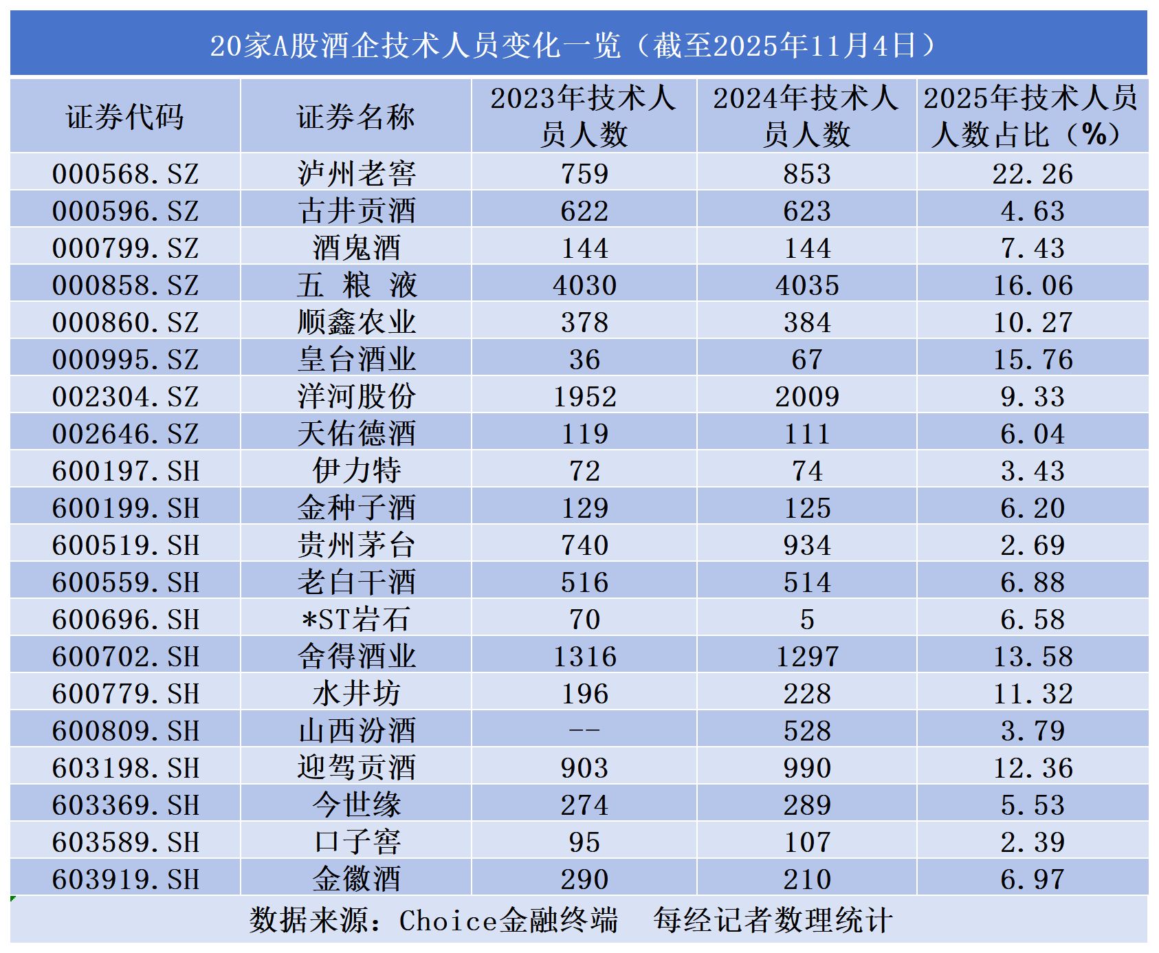 据《每日经济新闻·将进酒》记者不完全统计,2024年有超六成的酒企技术人员同比实现增长。其中,五粮液、洋河股份、舍得酒业的技术人员分别达到4035人、2009人、1297人。截至2025年11月,20家A股酒企中有7家酒企技术人员占比超10%,而泸州老窖技术人员占比超20%,五粮液技术人员占比超15%。