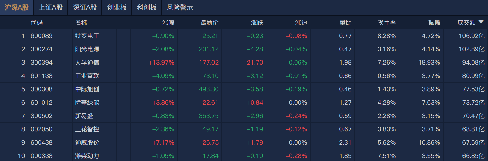 南财金融终端显示,个股方面,特变电工半日成交额超106亿元居首,阳光电源、天孚通信、工业富联成交额靠前。