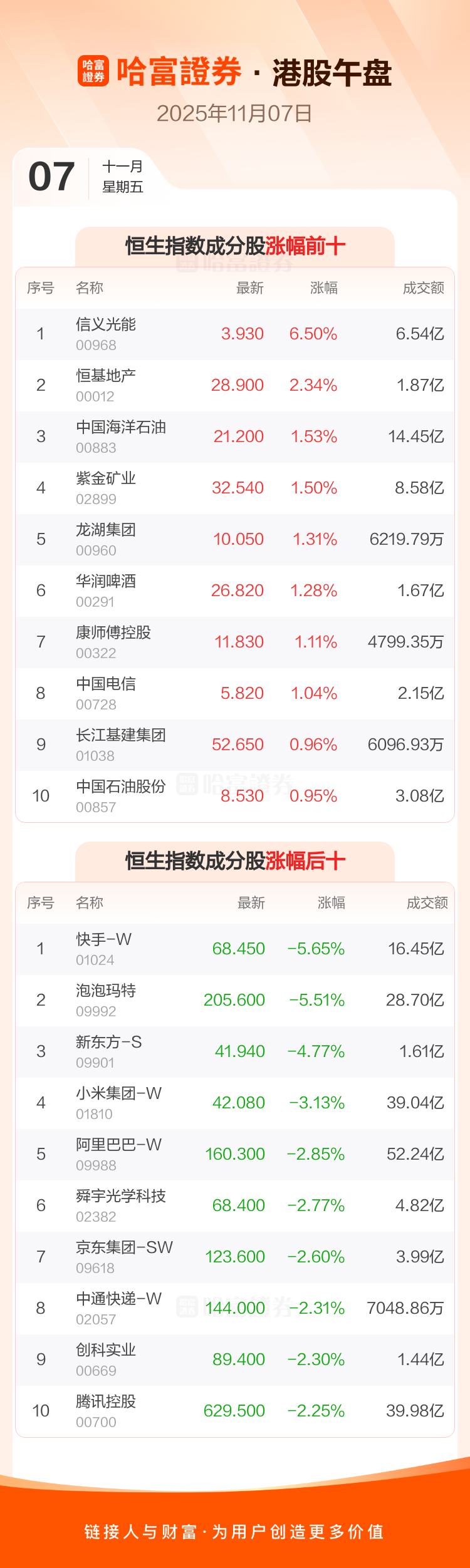 港股11月7日午盘走低 ,恒生指数收报26184.19点,跌301.71点,跌幅1.14%;恒生科技指数收报5825.62点,跌118.6点,跌幅2.0%。恒生指数成分股中信义光能、恒基地产、中国海洋石油涨幅居前,快手-W、泡泡玛特、新东方-S跌幅靠前。恒生科技指数成分股中小鹏汽车-W、比亚迪股份、百度集团-SW涨幅居前,快手-W、蔚来-SW、哔哩哔哩-W跌幅靠前。