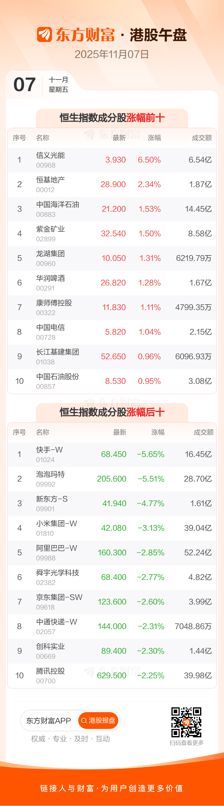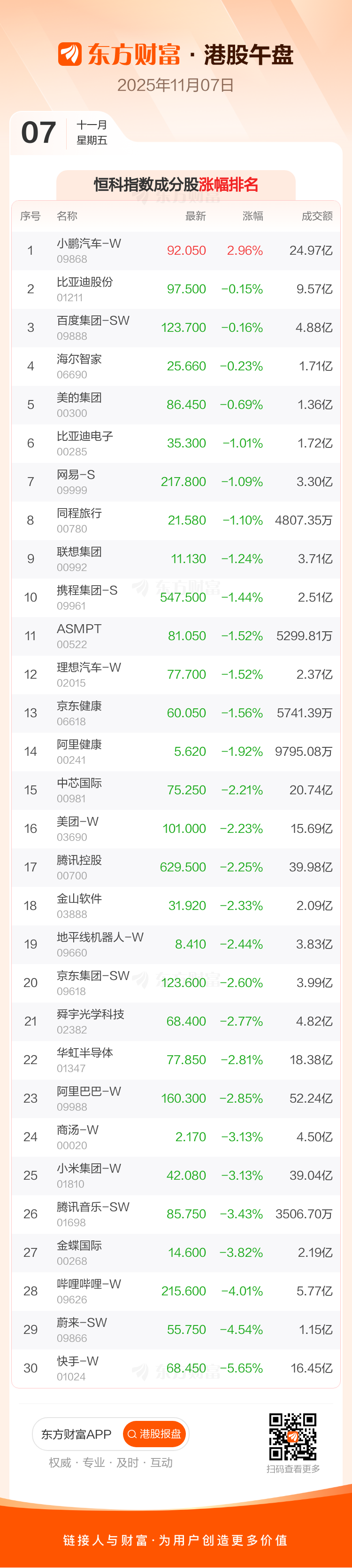 11月7日港股午盘:恒指跌1.14% 快手-W领跌成分股