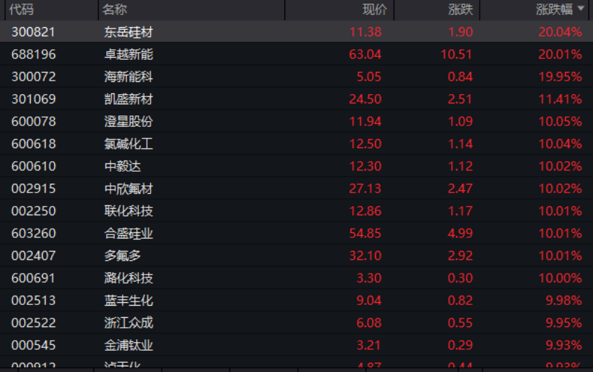 主要行业板块和赛道方面,若按照申万一级行业划分,基础化工板块领涨,板块涨幅超过2%,板块内多只个股直线拉升涨停。东岳硅材、卓越新能、海新能科等股票“20cm”涨停,凯盛新材大涨11.41%,另有澄星股份、氯碱化工、中毅达、中欣氟材等10多只股票涨停。