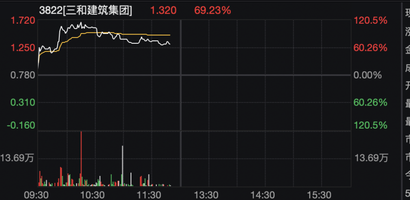 港股市场大幅波动的个股中,三和建筑集团大涨,盘中涨幅一度超过120%。
