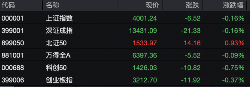 A股市场今天上午整体走低,主要指数不同程度下跌。截至上午收盘,上证指数跌0.16%,但守住4000点整数关口,深证成指跌0.16%,创业板指跌0.37%,科创50指数跌0.75%。
