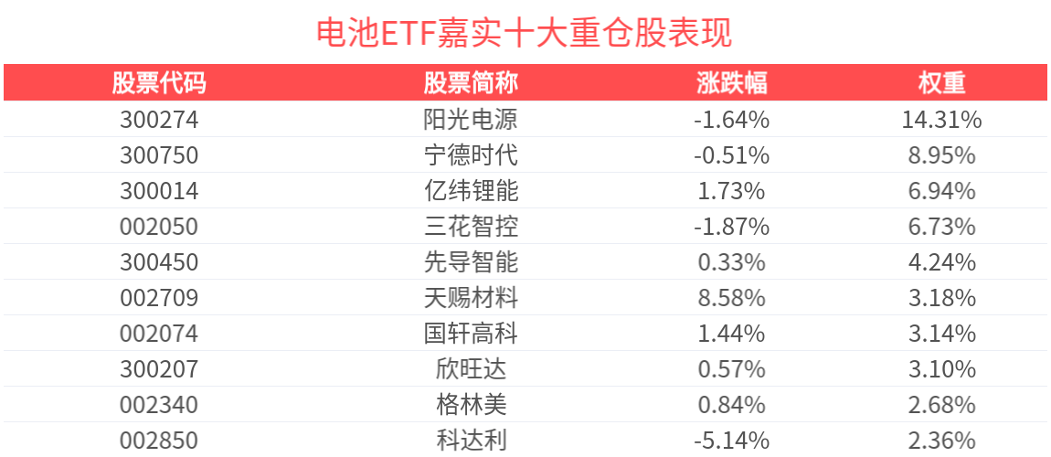 数据显示,截至2025年10月31日,中证电池主题指数前十大权重股分别为阳光电源、宁德时代、三花智控、亿纬锂能、先导智能、天赐材料、欣旺达、国轩高科、格林美、科达利,前十大权重股合计占比56.8%。