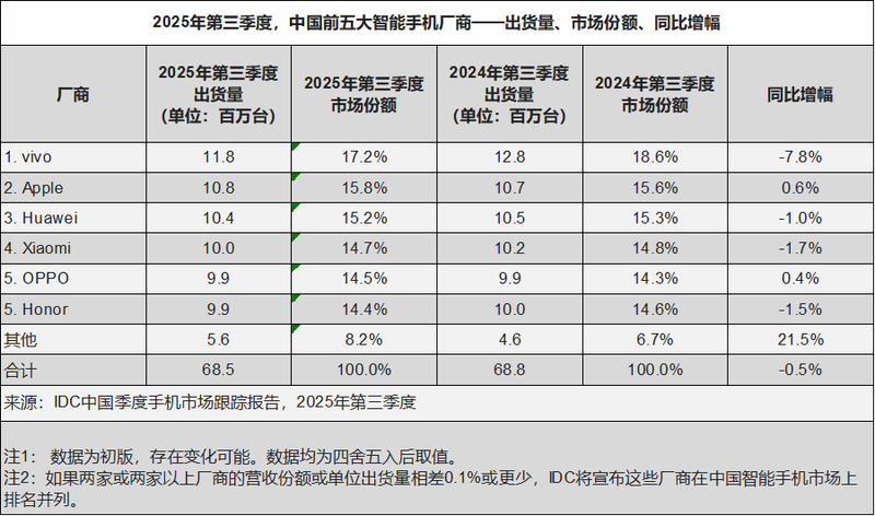 2025年第三季度,中国前五大智能手机厂商出货量。IDC公众号截图。