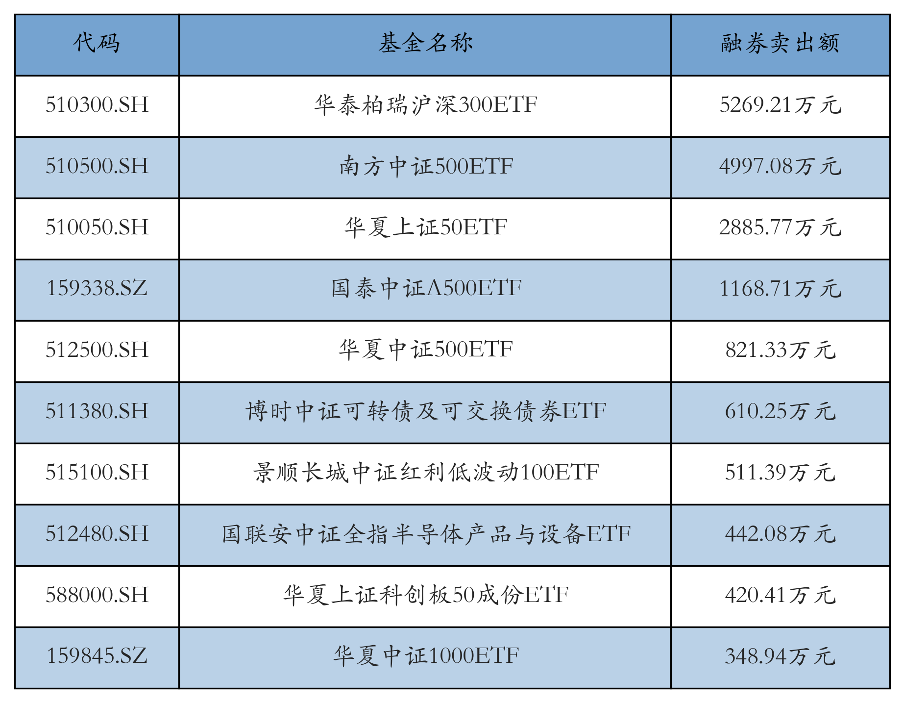 11月6日ETF融券卖出额前三位分别为:华泰柏瑞沪深300ETF(5269.21万元)、南方中证500ETF(4997.08万元)和华夏上证50ETF(2885.77万元),前10具体见下表: