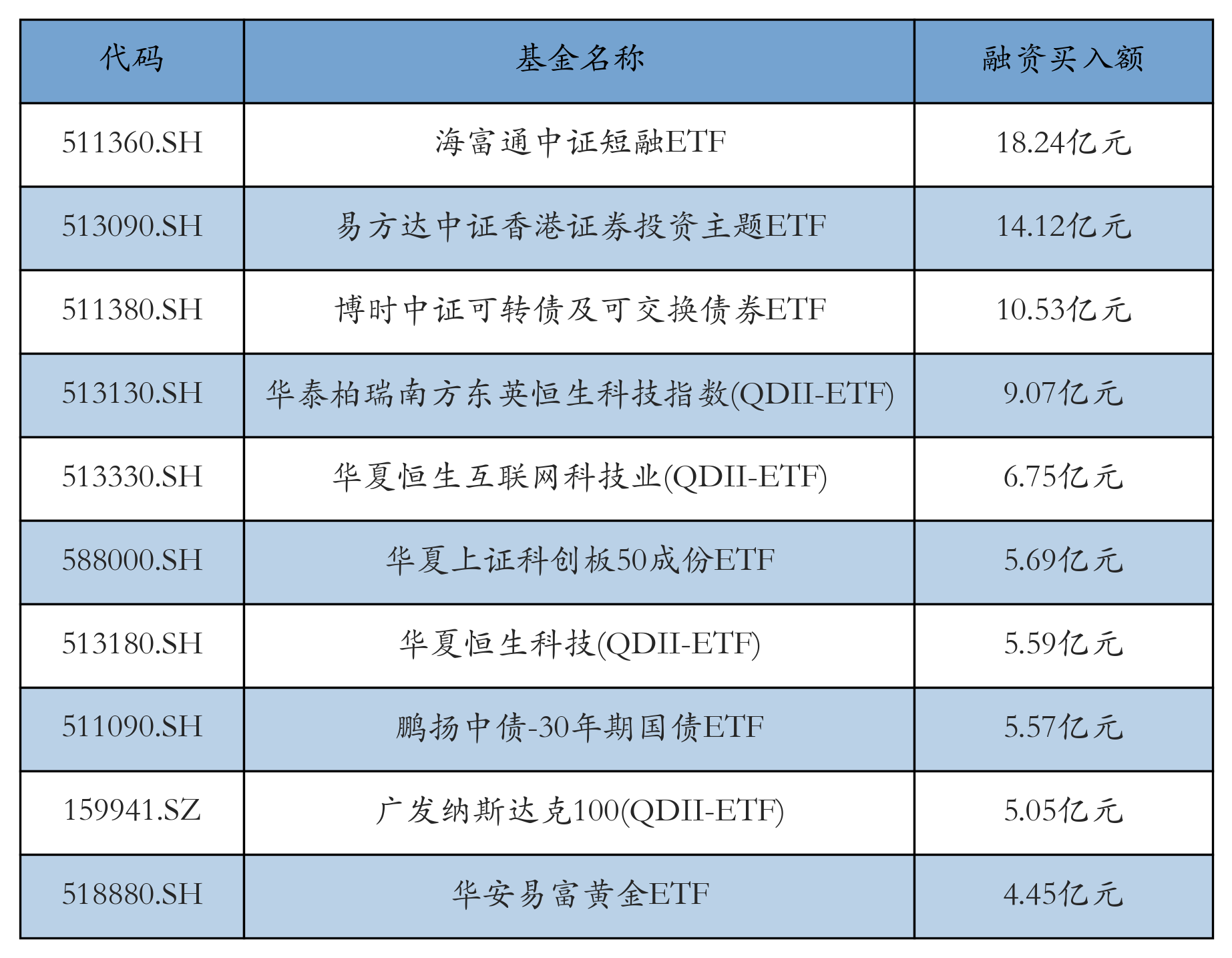 11月6日ETF融资买入额前三位分别为:海富通中证短融ETF(18.24亿元)、易方达中证香港证券投资主题ETF(14.12亿元)和博时中证可转债及可交换债券ETF(10.53亿元),前10具体见下表:
