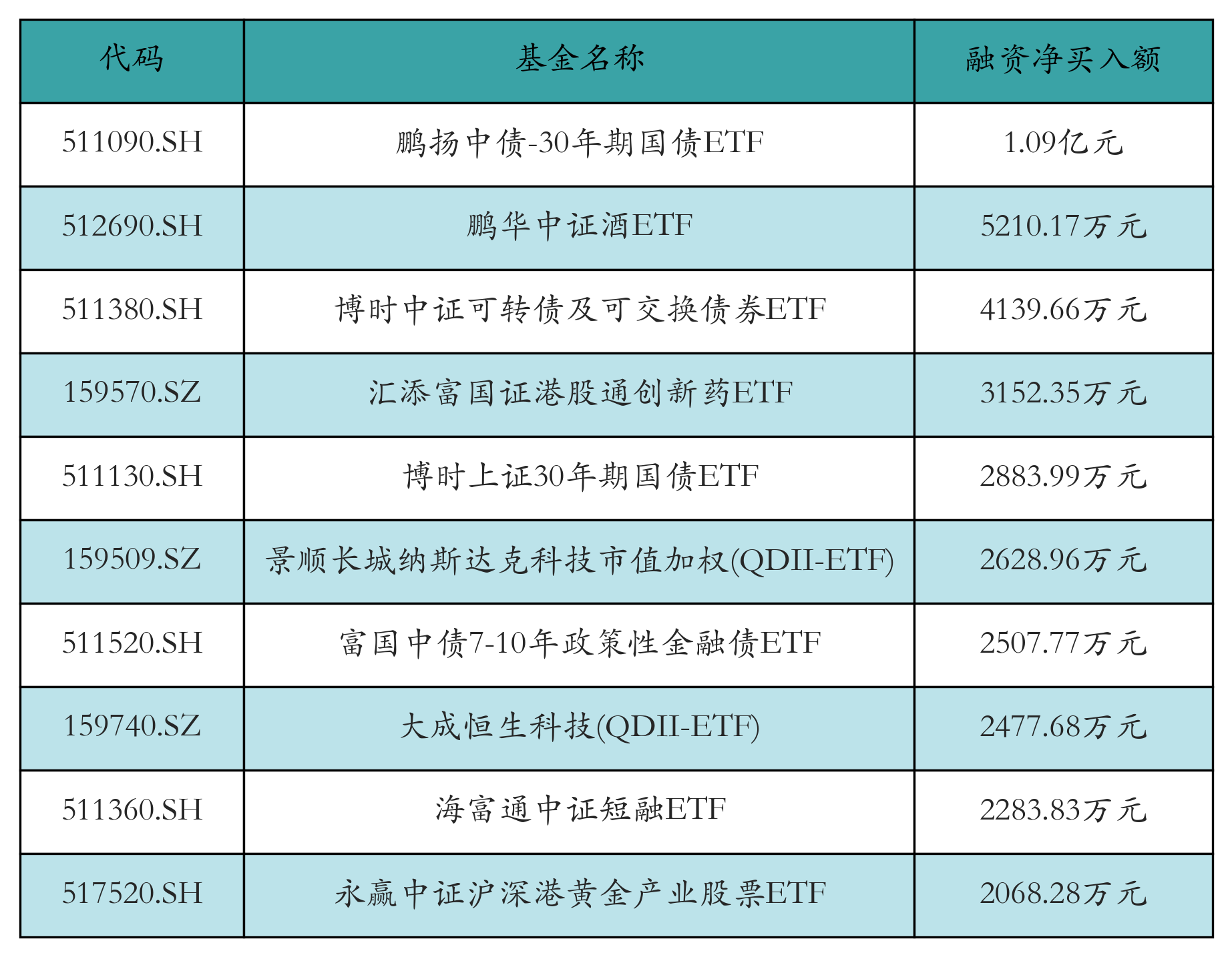 11月6日ETF融资净买入额前三位分别为:鹏扬中债-30年期国债ETF(1.09亿元)、鹏华中证酒ETF(5210.17万元)和博时中证可转债及可交换债券ETF(4139.66万元),前10具体见下表: