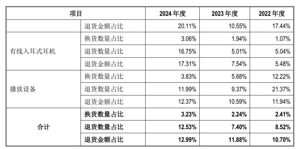 对此,海菲曼表示,2023年至2024年换货数量占比由2.24%提升至3.23%,退货金额占比由11.88%提升至12.99%,占比小幅提高,但退货数量占比由7.40%提升至12.53%,占比提升较多,主要系真无线耳机、有线入耳式的退货数量占比增加所致。