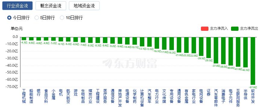 净流出方面,软件开发、半导体、互联网服务等净流出排名靠前,其中软件开发净流出66.96亿元。