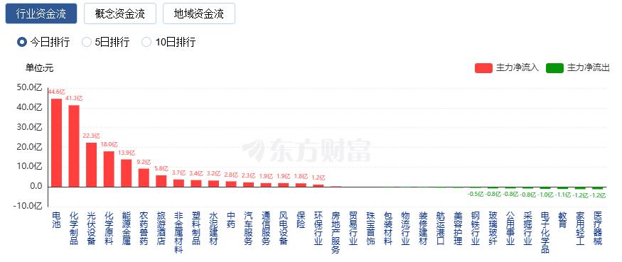 行业资金方面,截至收盘,电池、化学制品、光伏设备等净流入排名靠前,其中电池净流入44.56亿。