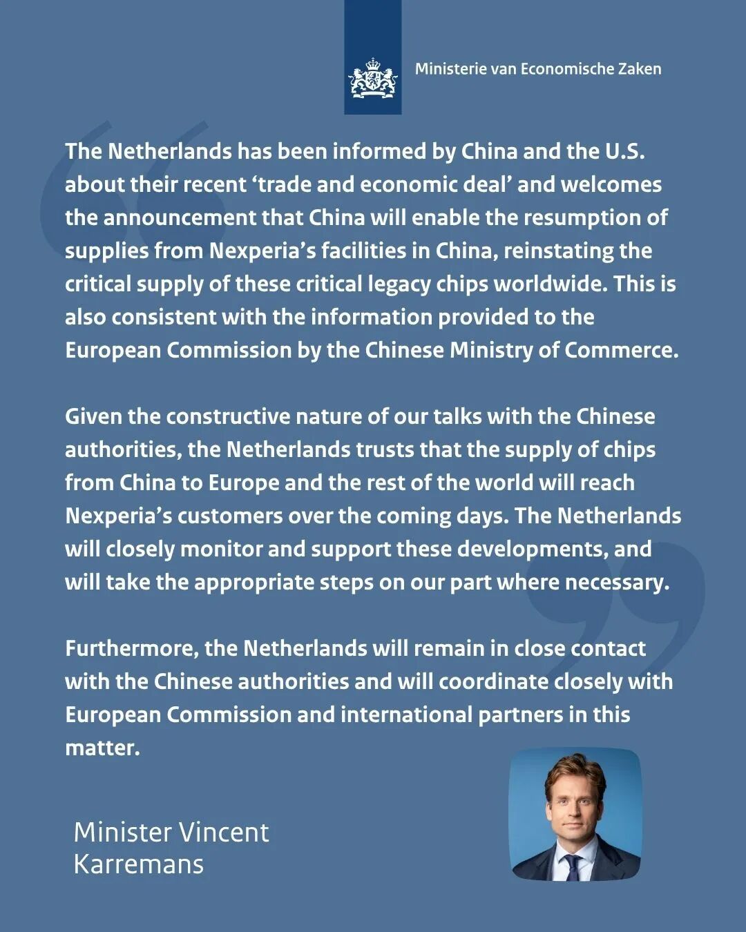 荷兰政府11月7日发布声明称,荷兰经济大臣卡雷曼斯表示,欢迎中方会为安世中国工厂恢复供货提供便利的表态,“鉴于我们同中方的会谈富有建设性,相信中国供应至欧洲和世界其它地区的芯片将在未来几天送达安世客户手中”。