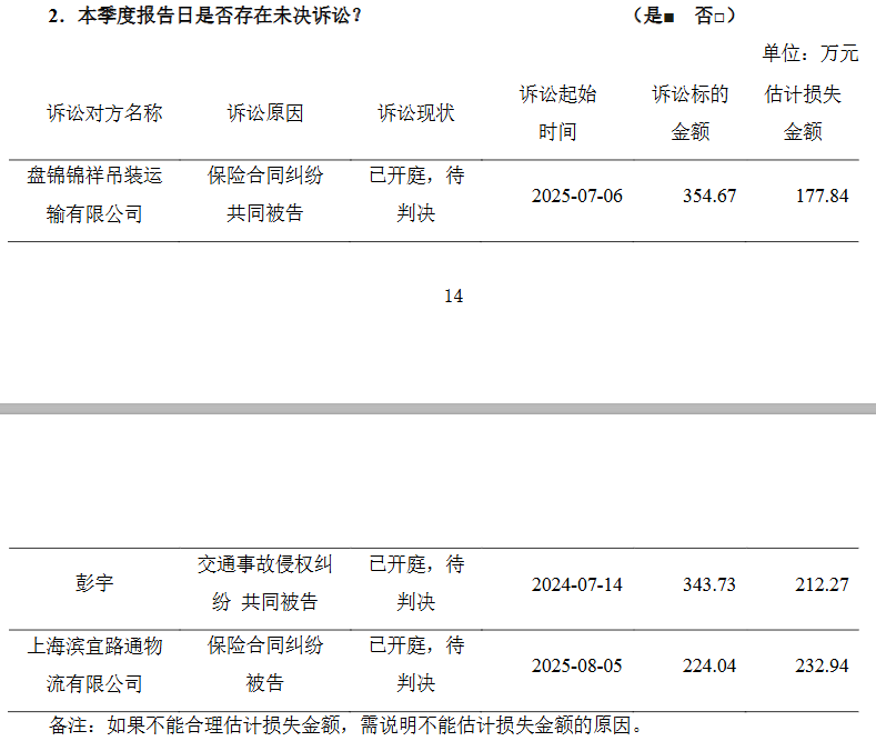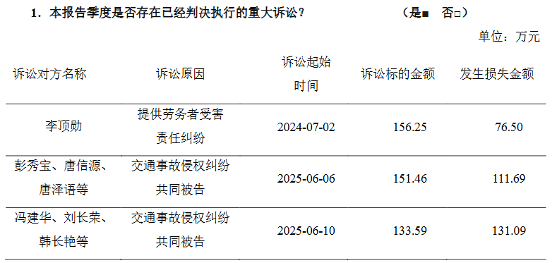 报告显示,在本季度,公司存在三起已经判决并执行完毕的重大诉讼案件。这三起案件总计诉讼标的金额达441.3万元,发生损失金额为319.28万元。