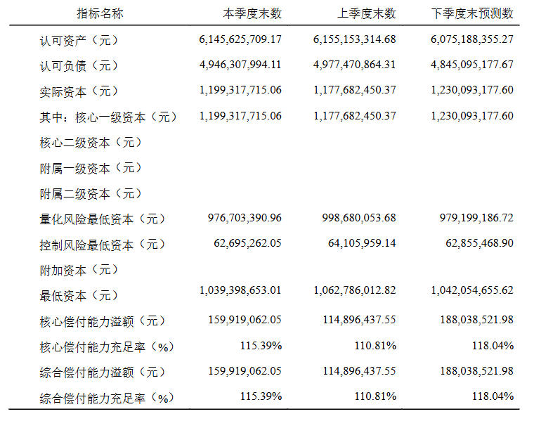 其中:实际资本主要受公司净资产增加影响,较上季度末增加2163.53万元,对偿付能力充足率正影响2.04个百分点;最低资本受保险风险、市场风险、信用风险综合影响,较上季度末减少2338.73 万元,对偿付能力充足率正影响2.49个百分点。