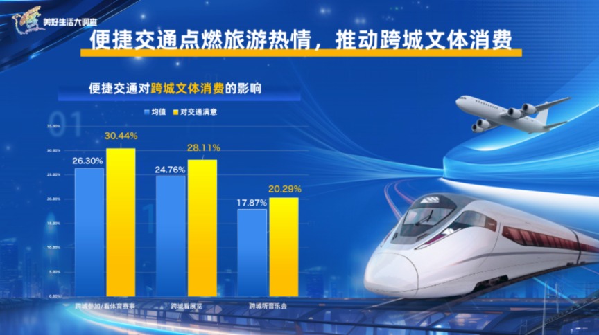 除了点燃旅游热情,交通便利也推动了跨城文化消费的提升。越来越多人不再执着于景点打卡,转而奔赴体育赛事、展览与音乐会。大调查发现,改善交通满意度高的人群,为了参加/看体育赛事跨城市消费的占比高出均值4个百分点,跨城看展览占比高出均值3个百分点,跨城看音乐会占比高出均值2个百分点以上。贵州村超以及苏超的火爆,都乘上了交通便捷的“快车”。