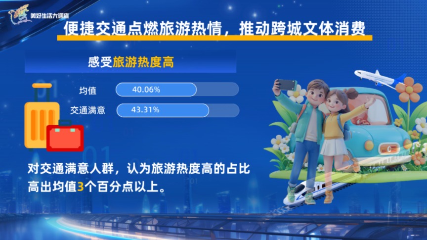 交通,不再只是抵达的手段,而是旅行的序章。大调查发现,交通改善直接点燃了旅游消费。对改善交通满意人群,认为旅游热度高的占比高出均值3个百分点以上。交通网络的完善直接激活了区域旅游活力。“早上出发、中午抵达、下午沉浸体验”,这样一种“当日达”的休闲节奏,正逐渐成为都市人群周末的主流选择。