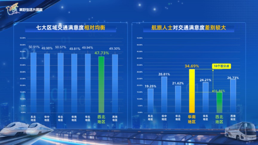 从七大区域来看,大家对交通方面的满意度整体相对均衡。除了西北地区满意度略低外,其他地区的数据差别不大。对航旅人士的调查却在地区上出现了明显差异。在航旅人士眼中,交通满意度最高的是华南地区的人,他们对改善交通方面的满意度比最低的西北地区高出18个百分点以上。