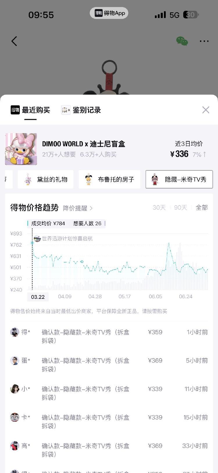 据悉,今年3月,DIMOO推出了与迪士尼联名的首款搪胶盲盒产品,该产品包括6个基本款和1个隐藏款。得物App数据显示,隐藏款“米奇TV秀”价格由179元上涨至784元,溢价3.4倍,截至目前,隐藏款市场价为359元,仍有1倍的溢价。由于联名IP产品较少出现补货的情况,因此市场价格一般较为稳定,今年6月,该系列隐藏款价格甚至迎来了一波增长,市场价格逼近发售初期的市场价格。