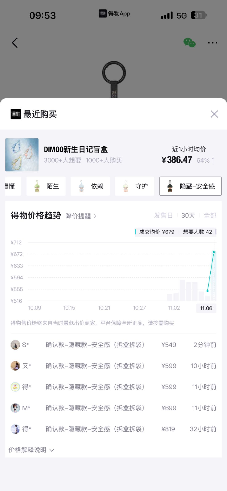 11月6日,泡泡玛特DIMOO全新系列“新生日记”发售,开售后秒售罄。11月7日,得物App数据显示,黑色的隐藏款“安全感”成交价由99元上涨至819元,溢价7.3倍,该溢价在搪胶盲盒隐藏款中属于中等水平。
