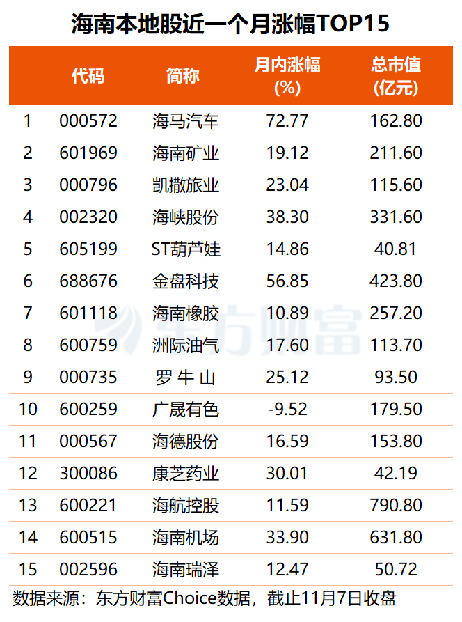 海南板块今日“卷土重来”,板块指数大涨2.16%,领涨所有地区板块。海马汽车、海南矿业双双封涨停,凯撒旅业、海峡股份、金盘科技等多股跟涨。
