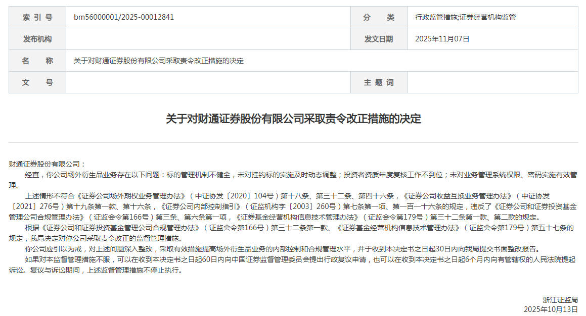 11月7日,根据浙江证监局公告,财通证券(601108)因场外衍生品业务存在多项问题,被采取责令改正的措施。
