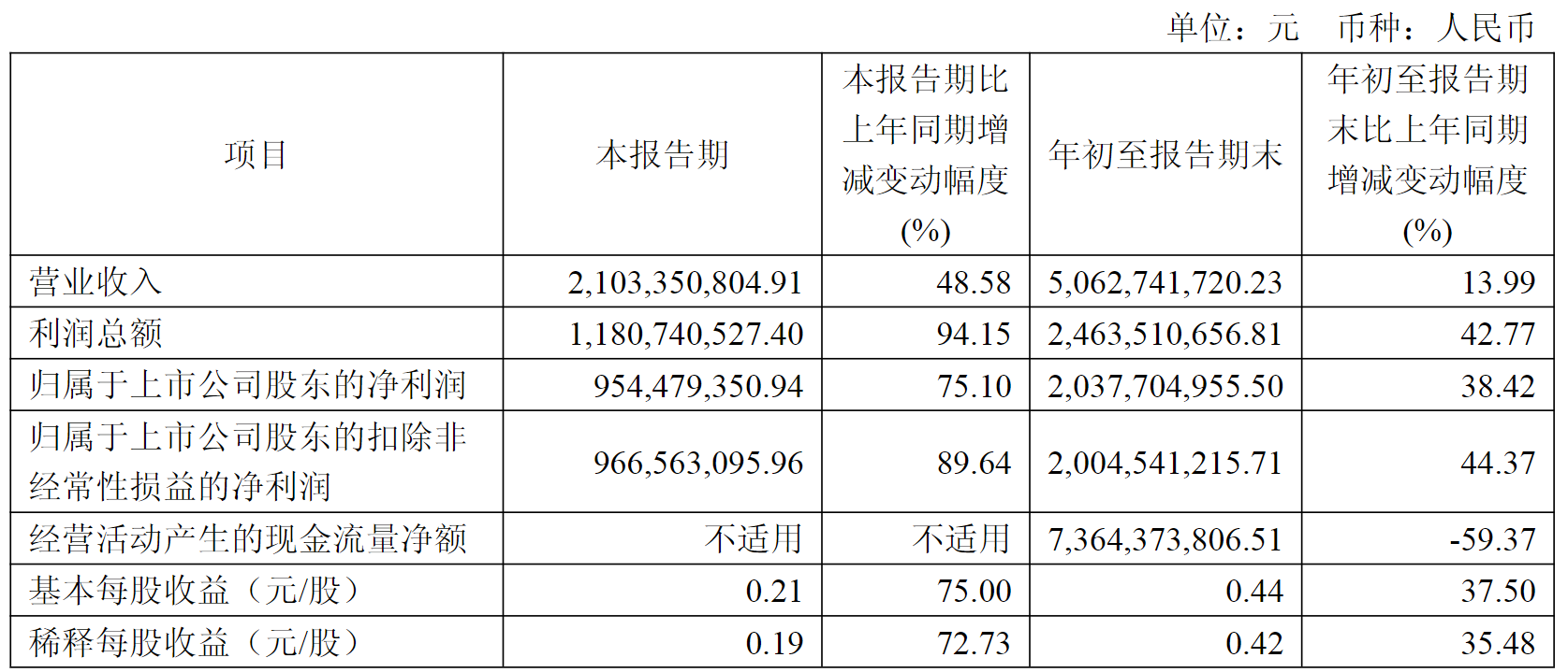 今年前三季度,财通证券实现营业收入50.63亿元,同比上涨13.99%;归母净利润20.37亿元,同比上涨38.42%;其中,第三季度,公司营业总收入达21.03亿元,同比增幅高达48.58%;净利润9.54亿元,同比增长75.10%。