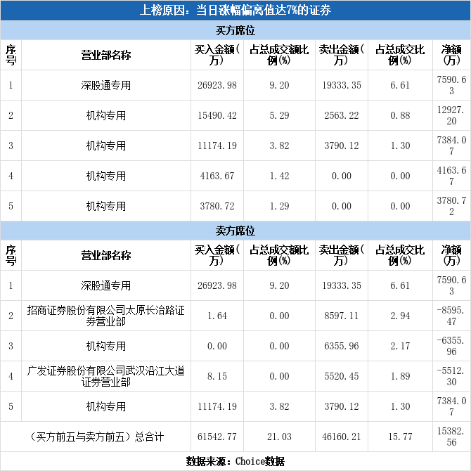 今日龙虎榜单上出现了深股通的身影,占据了买一、卖一的位置,净买入7590.63万元,占当日成交总额的2.59%。