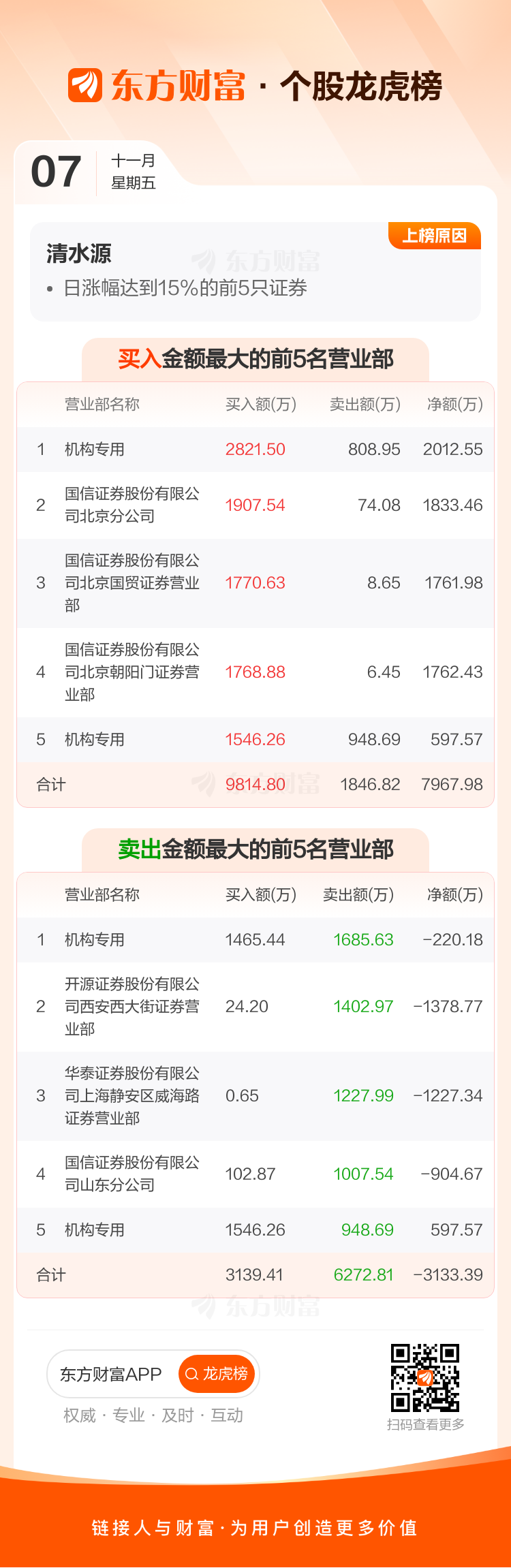 交易所2025年11月7日公布的交易公开信息显示,清水源因成为日涨幅达到15%的前5只证券、连续三个交易日内,涨幅偏离值累计达到30%的证券上榜。清水源当日收报14.66元,涨跌幅19.97%,偏离值20.00%,换手率32.37%,成交额7.62亿。异常期间11月6日至11月7日,期间涨幅44.01%,累计偏离值43.23%,区间成交额13.35亿。