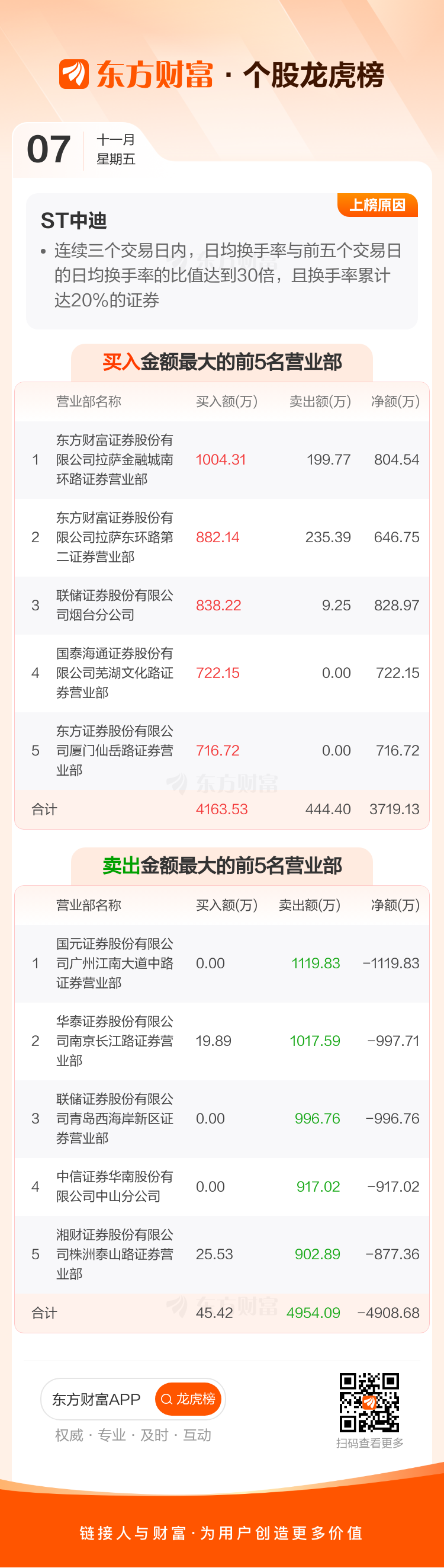 交易所2025年11月7日公布的交易公开信息显示,ST中迪因成为连续三个交易日内,日均换手率与前五个交易日的日均换手率的比值达到30倍,且换手率累计达20%的证券上榜。ST中迪当日收报9.25元,涨跌幅4.99%,换手率20.36%,成交额5.41亿。异常期间11月7日至11月7日,期间涨幅4.99%,累计偏离值20.36%,区间成交额5.41亿。